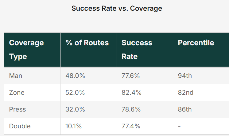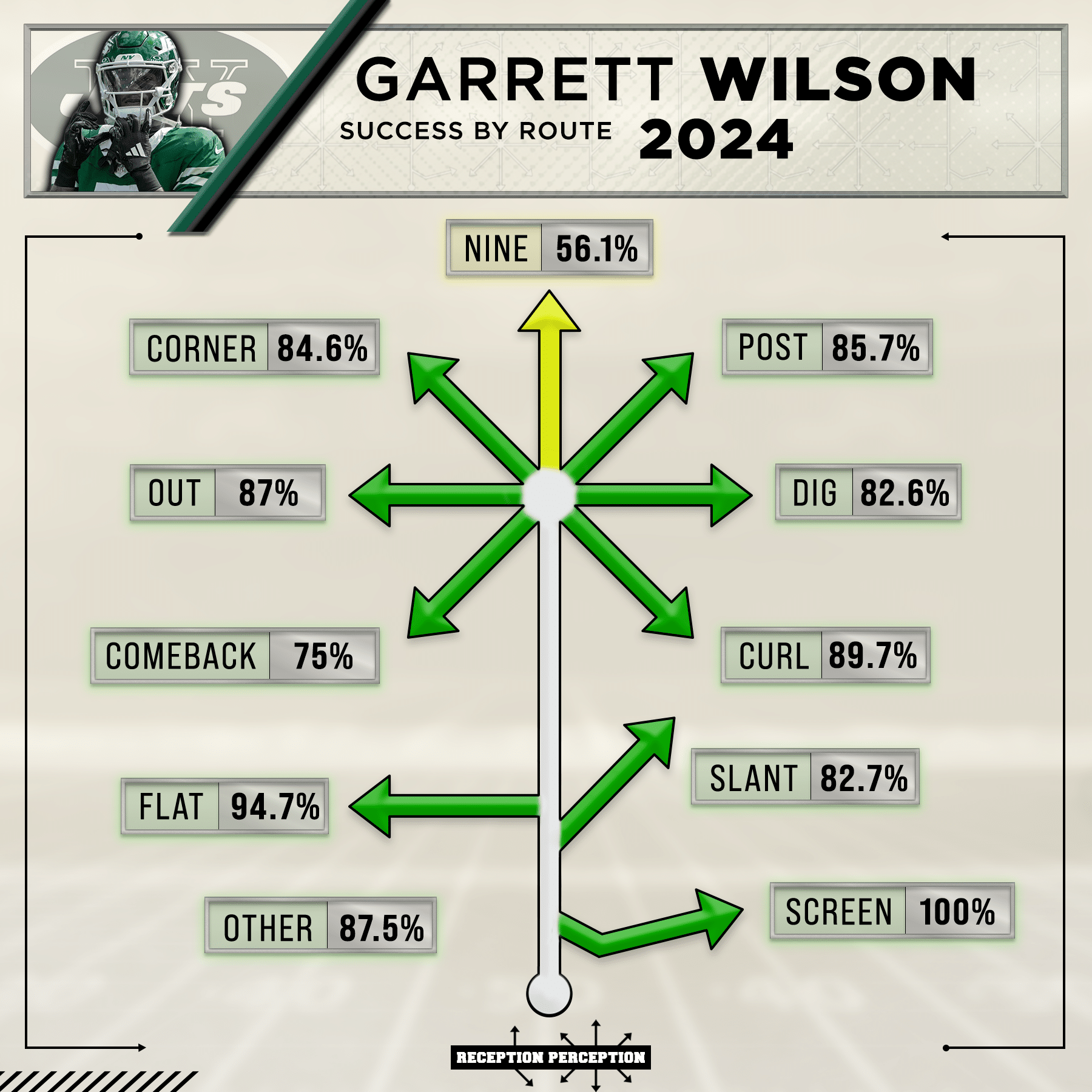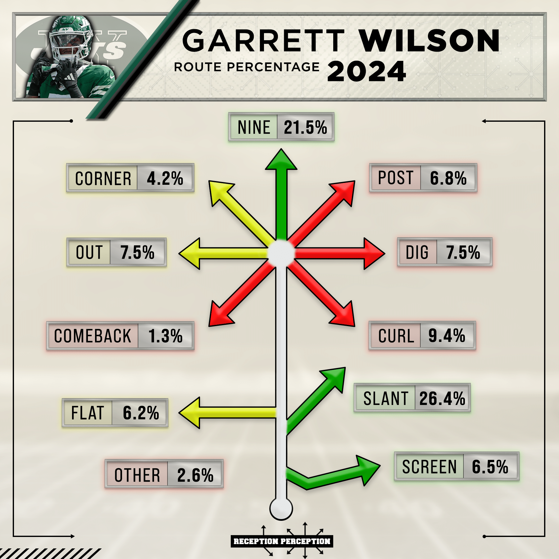 Garrett Wilson is one of the best separators in the league, and his nearly all-green success rate chart backs it up. The wild part? The Jets barely schemed him. He was stuck running mostly go balls and slants, instead of being moved around to weaponize his elite route running. Despite that handicap, he still finished top 5 in receptions, targets, routes, and pass snaps. That usage isn’t going anywhere in 2025.