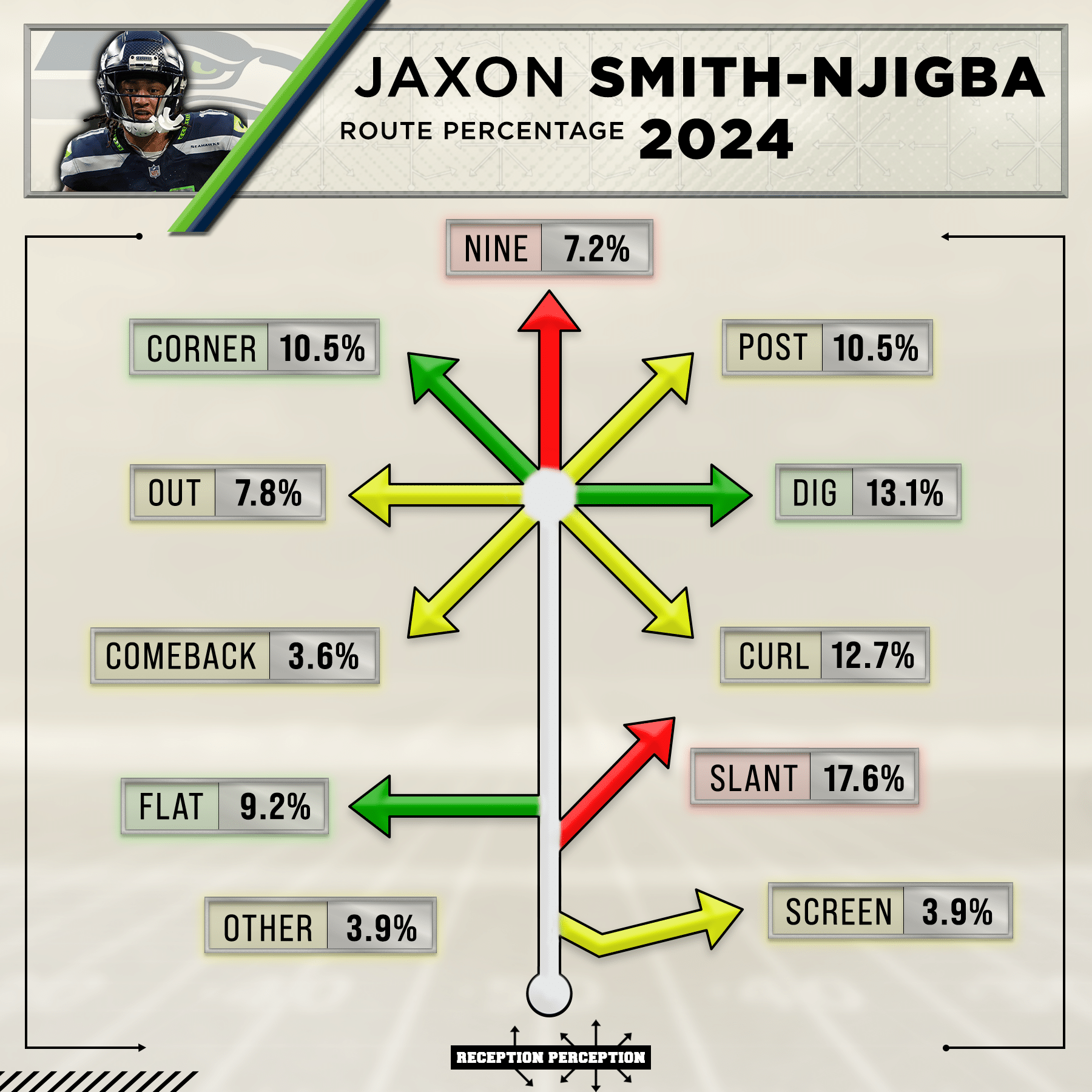 JSN ran 625 routes last year, the 6th most in the league. Over 30% came near the line of scrimmage, which tracks with his 75th-ranked aDOT, and he dominated those looks. Volume was the engine: 7th in pass snaps, 11th in targets, 7th in receptions. But if that efficiency dips? He’ll need to fix the 72nd-ranked YPR.